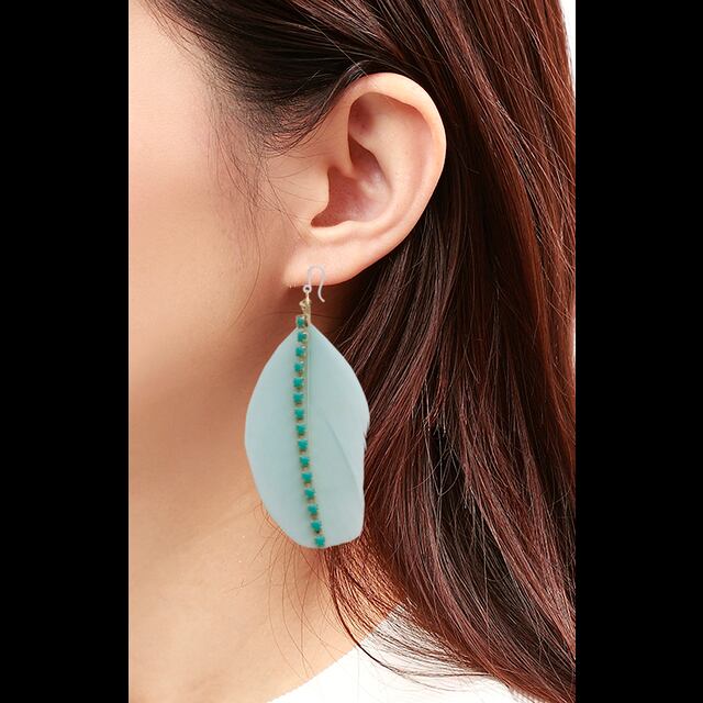 自然の美しさを感じる、羽とターコイズをモチーフにしたイヤリングです。軽やかに揺れる羽のデザインが、あなたの動きに合わせて優雅な印象を与えます。ターコイズの鮮やかな色合いが、アクセントとなり、どんなコーディネートにも華やかさをプラス。