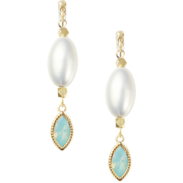 パシフィックオパールの水のような透明感と、スワロフスキーの煌めきが織りなす、フォーマルな場面にぴったりのイヤリングです。オフホワイトのパールとゴールドのメタルパーツが、上品で洗練された印象を与えます。シンプルながらも存在感のあるデザインで、特別な日の装いをさらに引き立てます。